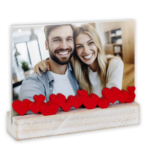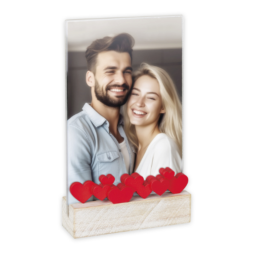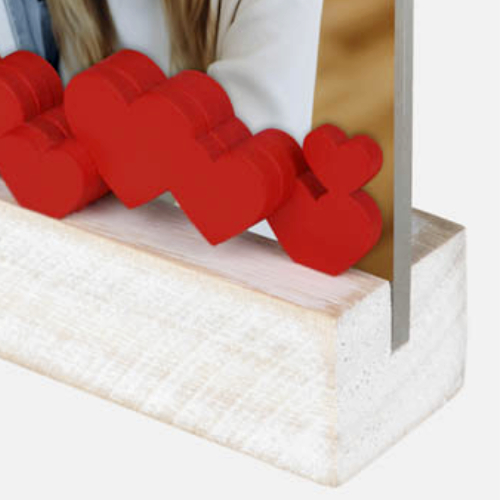 Cornice in Plexi con basetta in legno naturale con decori a forma di cuori rossi